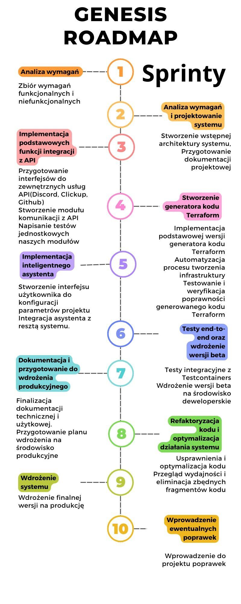 G艂贸wne cele biznesowe projektu to zwi臋kszenie efektywno艣ci pracy zespo艂贸w IT, skr贸cenie czasu wdra偶ania nowych projekt贸w oraz zmniejszenie koszt贸w zwi膮zanych z tworzeniem i utrzymaniem infrastruktury. Genesis umo偶liwia szybkie i bezproblemowe uruchamianie projekt贸w IT, integruj膮c si臋 z zewn臋trznymi API oraz wykorzystuj膮c generator kodu Terraform do automatycznego budowania i konfiguracji 艣rodowisk, co przyspiesza procesy wdra偶ania oraz zarz膮dzania projektami.