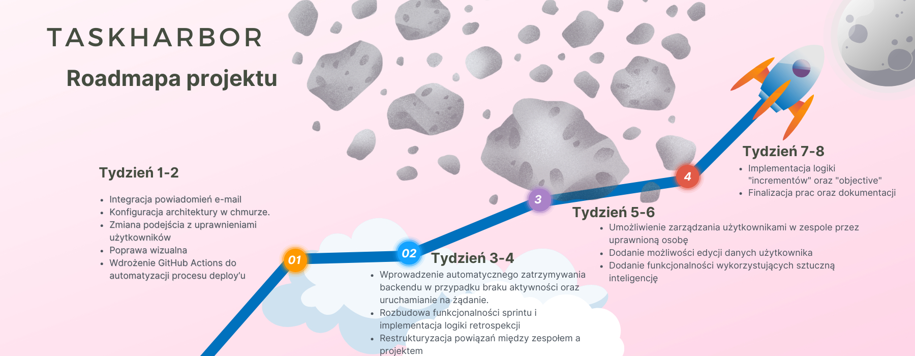 Java i TypeScript są podstawowymi językami użytymi w projekcie. Spring Boot obsługuje backend, a Next.js frontend. PostgreSQL zapewnia bazę danych, a modele AI automatyzują opisy zadań. TaskHarbor działa w chmurze AWS i Google Cloud (SSO). Liquibase ułatwia migracje, Docker obsługuje konteneryzację, a Git (GitHub) zarządza wersjami. Projekt korzysta z metodyki SCRUM: Jira umożliwia zarządzanie zadaniami i projektami zgodnie z metodyką SCRUM. Confluence wspiera tworzenie dokumentacji. ESLint zapewnia spójność kodu. JetBrains (IntelliJ IDEA) i VS Code są używane do tworzenia projektu. Apache Tomcat obsługuje serwer aplikacji Java. Canva wspiera tworzenie wizualnych zasobów projektowych. DataGrip i DBeaver ułatwiają zarządzanie bazą danych PostgreSQL. Material-UI i Tailwind CSS przyspieszają tworzenie interfejsów użytkownika. Socket.io obsługuje komunikację w czasie rzeczywistym. Swagger dokumentuje API, a GitHub-Actions automatyzują CI/CD.