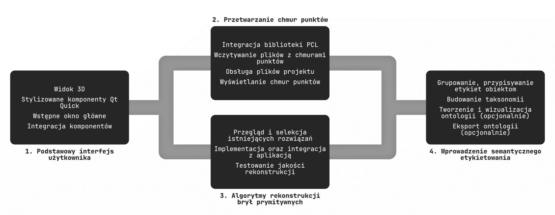 Dodatkowym elementem będzie zdefiniowanie sposobu semantycznego opisu tych obiektów, czyli nadawaniu im nazw, dodawaniu atrybutów oraz definiowaniu relacji między nimi. Narzędzie umożliwiać będzie wizualizację chmur punktów oraz efektów obliczeń w przestrzeni 3D oraz budowanie modeli o charakterze semantycznym, zgodnych z opracowaną metodą opisu.