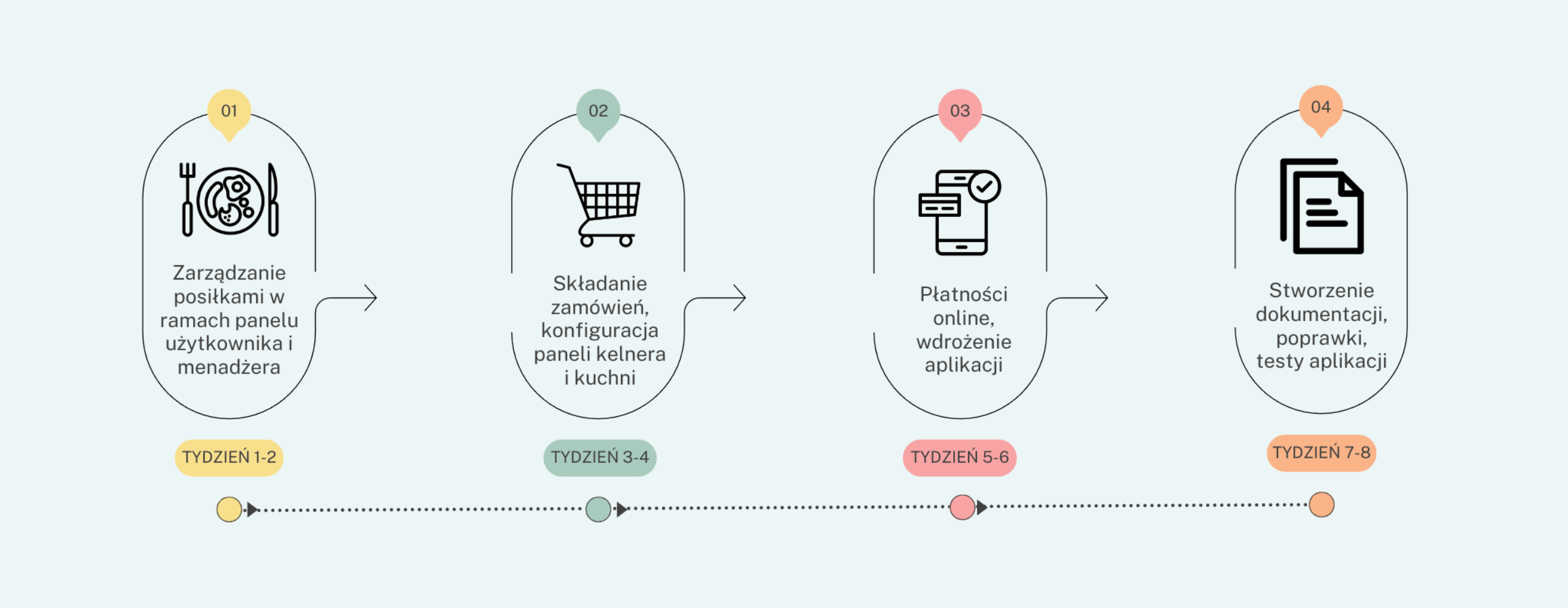 Zamierzamy stworzyć kompleksową aplikację dla restauracji, która umożliwi zarządzanie restauracją, rezerwacjami oraz zamówieniami z poziomu menadżera, kucharza oraz kelnera. Aplikacja umożliwi także zamawianie posiłków przez klientów, oraz rezerwacje miejsca w restauracji na daną godzinę. Jako zespół, mamy w planach umożliwić klientowi m.in. płatność online, skanowanie kodów QR do rezerwacji stolika, a także system rekomendacji posiłków, oraz algorytm optymalnego doboru stolików dla rezerwacji.
