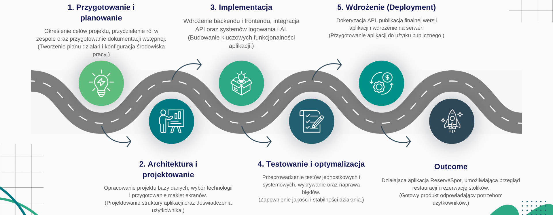 Końcowe produkty projektu: Aplikacja mobilna ReserveSpot (Android) Główny produkt projektu – nowoczesna aplikacja mobilna umożliwiająca: Wyszukiwanie restauracji według lokalizacji, rodzaju kuchni i preferencji użytkownika. Przeglądanie opinii innych klientów oraz automatycznie generowanej sumarycznej recenzji tworzonej przez zintegrowany model językowy (LLM). Otrzymywanie spersonalizowanych rekomendacji restauracji na podstawie historii odwiedzin i ocen. Wyszukiwanie w języku naturalnym, np. „Mam ochotę na ramen w centrum Wrocławia”. Zarządzanie kontem użytkownika, listą ulubionych lokali oraz historią odwiedzin.