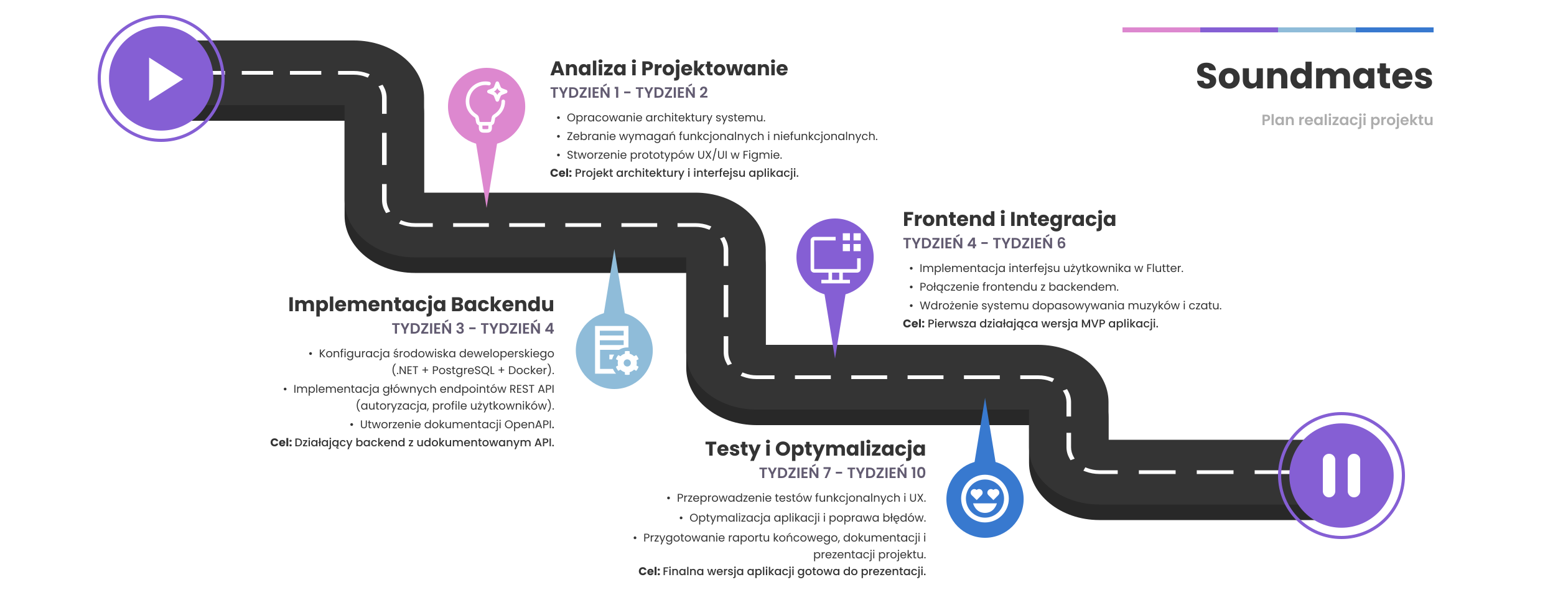 Zadania: Opracowanie aplikacji webowej i mobilnej umożliwiającej zakładanie profili artystów, przeglądanie użytkowników i nawiązywanie współpracy. Implementacja systemu wzajemnego dopasowywania użytkowników. Integracja backendu z bazą danych PostgreSQL i frontendem Flutter. Przeprowadzenie testów funkcjonalnych i UX z udziałem muzyków.